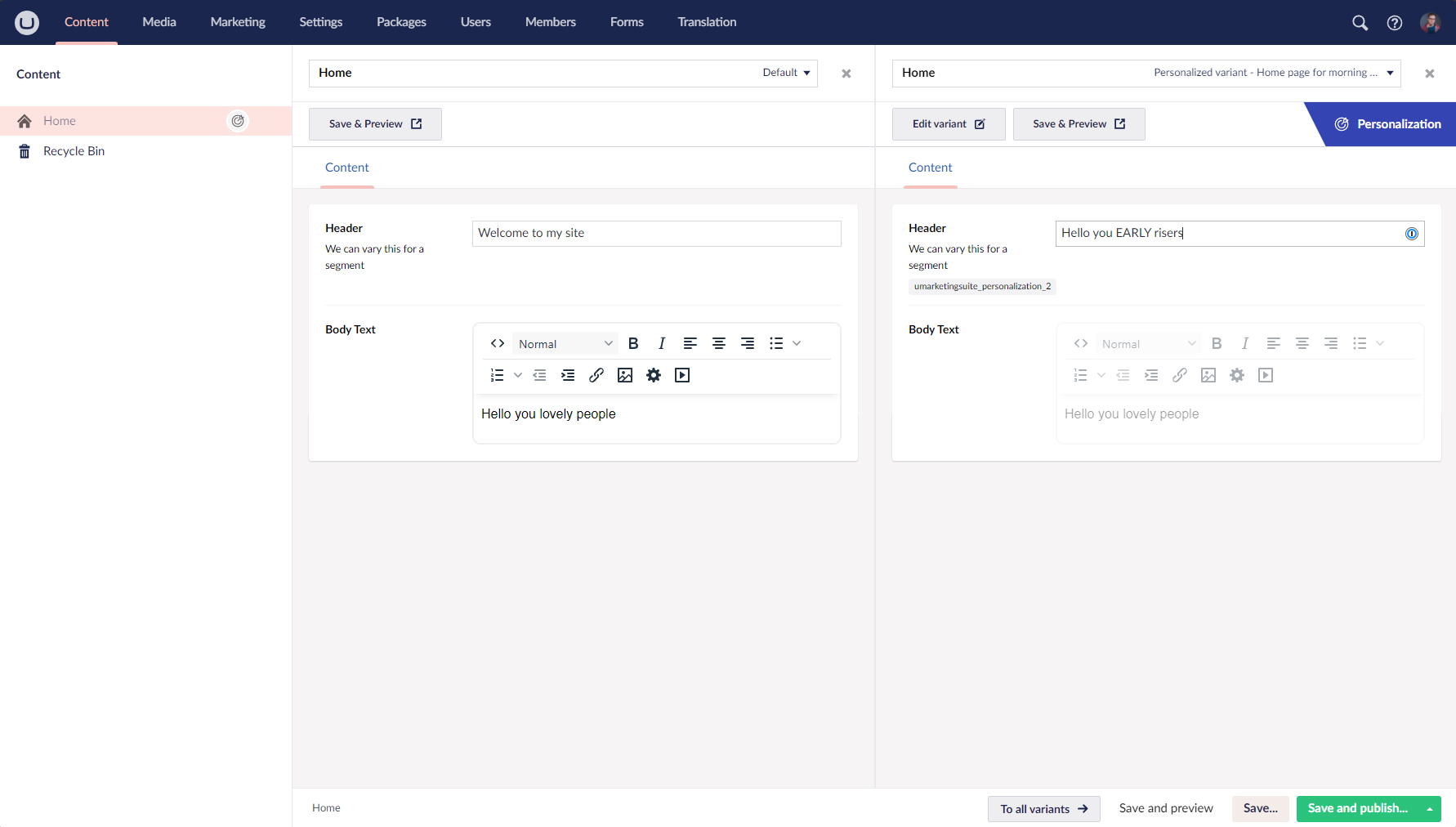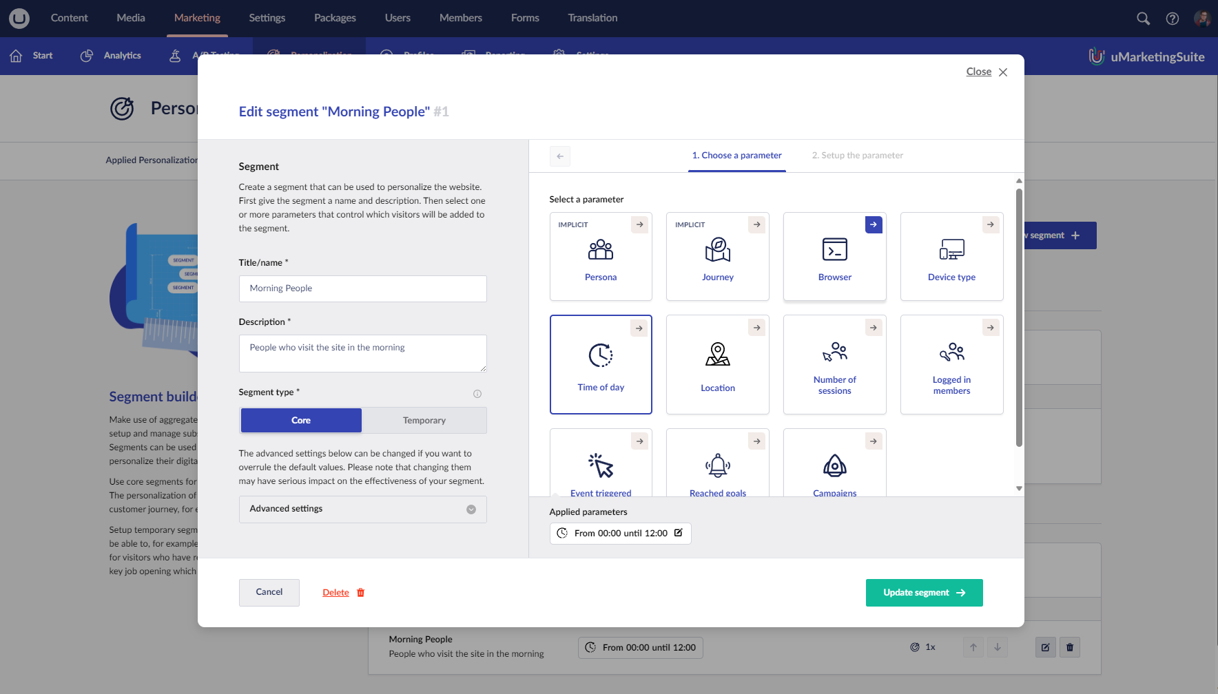 - With uMarketingSuite goto the Marketing Section and the Personalization section