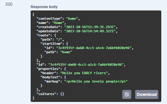 - Repeat the earlier steps to fetch the content by it's path and you should note that the JSON of the content node and the header property now contains our personalized content Hello you EARLY risers
